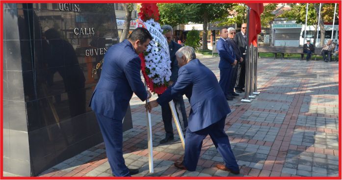 Cumhuriyet Parkı'ndaki törende Karaman Muhtarlar Derneği Başkanı Ali Öngay, Atatürk Anıtı'na çelenk bıraktı.