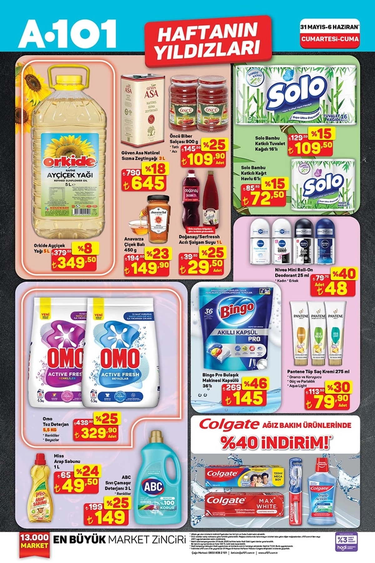 A101’de bugün itibarıyla satışa çıkan gıda ürünleri ve temizlik malzemeleri, cazip fiyatlarıyla öne çıkarken, mutfakların vazgeçilmezlerinden Orkide Ayçiçek Yağı 5 litre 349,50 liradan satışa çıktı. Bunun yanı sıra, Güven Asa Natürel Sızma Zeytinyağı 3 litre 645 liradan raflardaki yerini alırken, Öncü Biber Salçası 900 gr 109,90 liradan, Anavarza Çiçek Balı 450 gr ise 149,90 liradan satılmaya başlandı.
