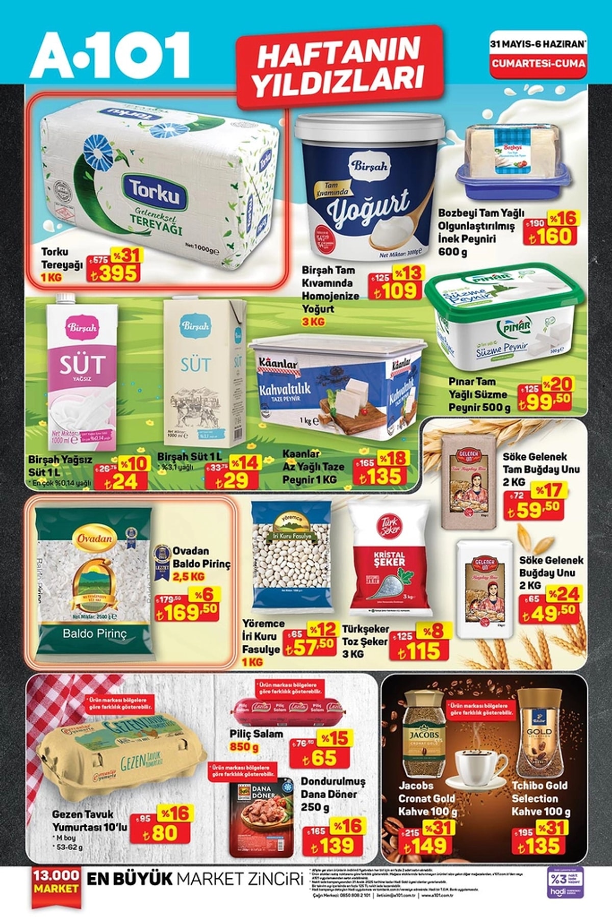 Bunun yanı sıra, Birşah 3 kg yoğurt 109 lira, Kaanlar 1 kg taze peynir 135 lira ve Pınar 500 gr süzme peynir 99,50 lira fiyatla satışa sunulurken, Türkşeker 3 kg toz şeker 115 lira, Ovadan 2,5 kg baldo pirinç ise 169,50 liradan alıcı bekliyor.