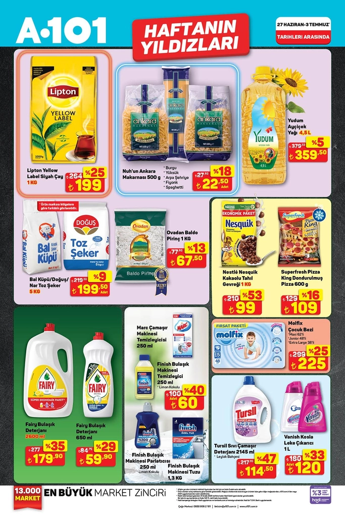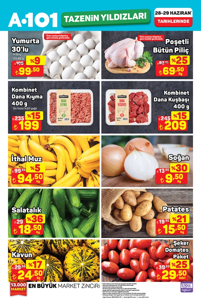 A101, 3 Temmuz'a kadar geçerli kampanyalarıyla öne çıkarken, temel gıda ürünlerinden süt ve süt ürünlerine, et ürünlerinden meyve-sebzeye kadar pek çok üründe uygun fiyatlarıyla tüketicilerin yüzünü güldürmeye devam ediyor.