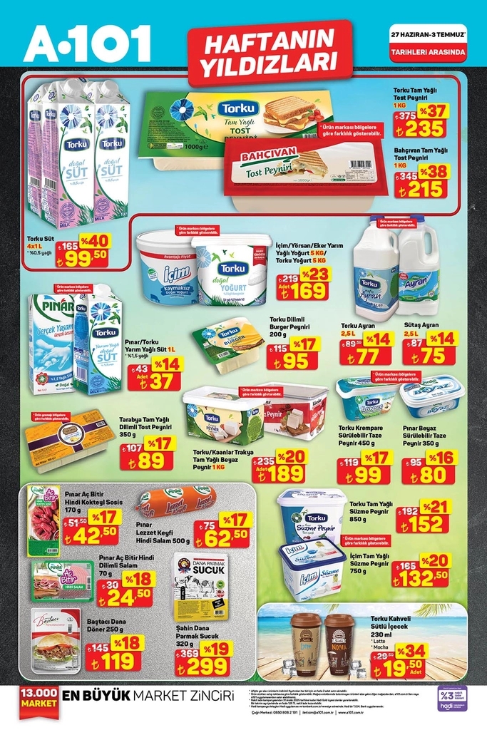 Bu kapsamda, Torku Süt 4x1L sadece 99,50 liradan raflardaki yerini alırken, Torku Tam Yağlı Tost Peyniri 149 lira, İçim ve Torku yoğurt çeşitleri ise 169 liradan satılıyor. Aynı zamanda, poşetli bütün piliç 69,50 lira/kg, dana kıyma 199 lira ve dana kuşbaşı 209 lira gibi uygun fiyatlarla tüketicileri bekliyor.