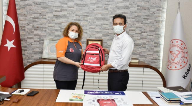 Ziyaret, İl Afet ve Acil Durum Müdürü Şerife Han’ın İl Milli Eğitim Müdürü Mehmet Çalışkan’a afet çantası hediye etmesiyle sona erdi.