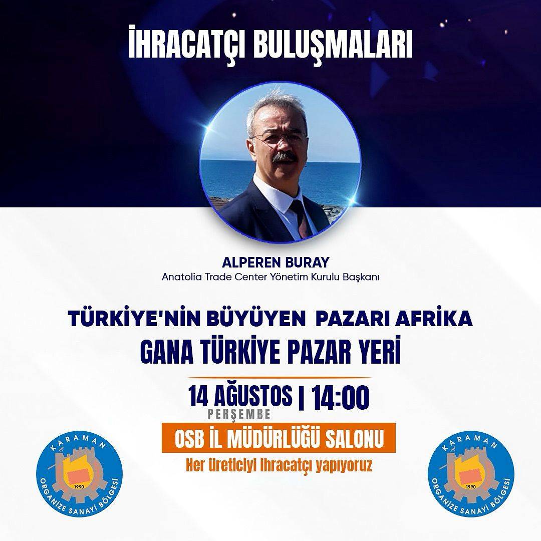Karaman Organize Sanayi Bölgesi (OSB) Müdürlüğü ile Hacettepe Export iş birliğiyle, Afrika’daki ticaret fırsatları tanıtılacak. 14 Ağustos 2025 Perşembe günü saat 14.00’te Karaman OSB Müdürlüğü binasında gerçekleştirilecek etkinlikte, Gana’nın başkenti Akra’da faaliyete geçecek Türk Ticaret Merkezinin sunumu firma sahibi Alperen Buray tarafından yapılacak.