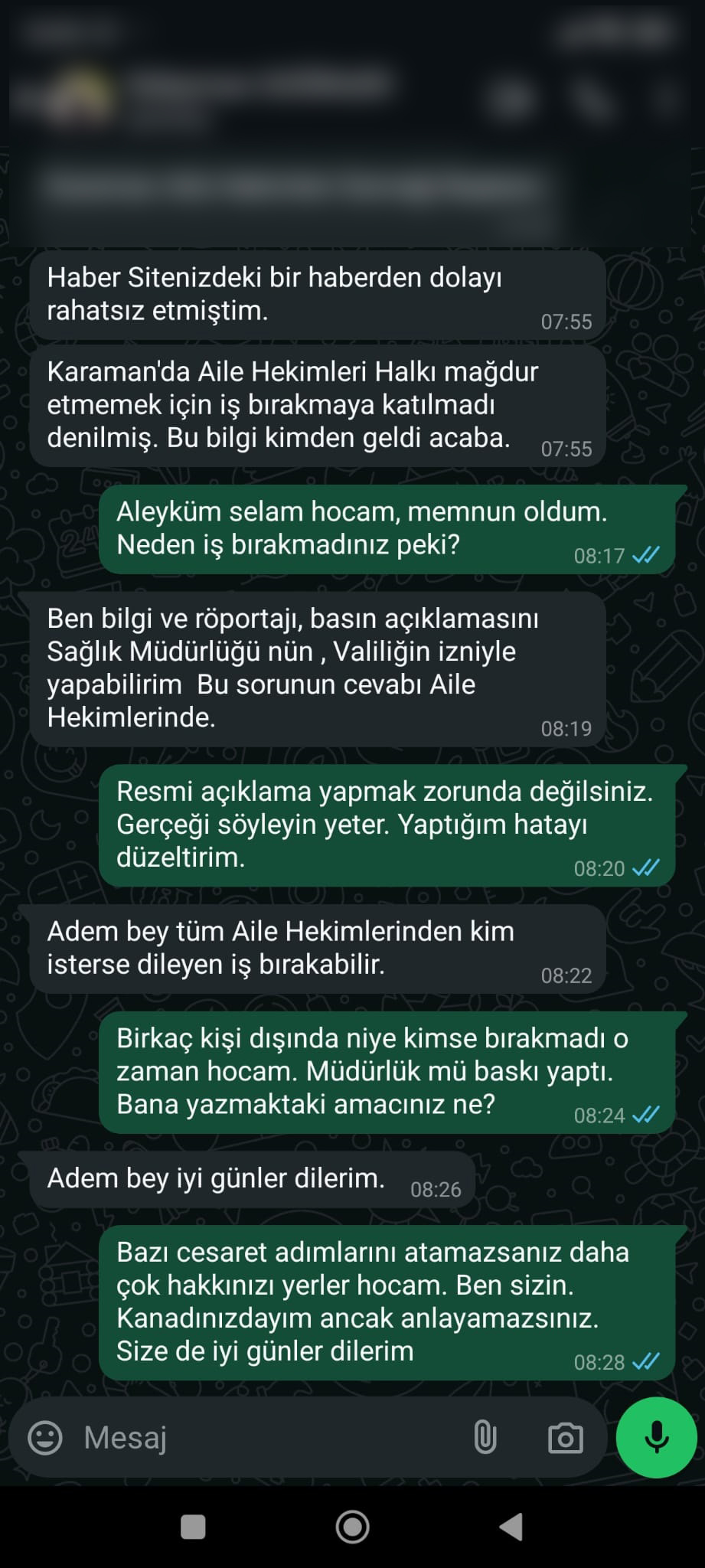 Aile hekimlerinin halkın sağlık hizmetlerinden mahrum kalmasını kesinlikle önemsediklerini ancak STK’lar aracılığıyla yapılan iş bırakma çağrısına uymamalarının asıl nedenin farklı olduğuna dikkat çektiler. Biz de kendilerine, “O zaman asıl mesele halkın sağlık hizmetlerinden mahrum kalıp kalmaması değil ise başka ne olabilir” bağlamında sorumuzu yönelttik ancak bu sorumuza yanıt vermeye çekindiler. İşte o konuşmalardan bir tanesi: