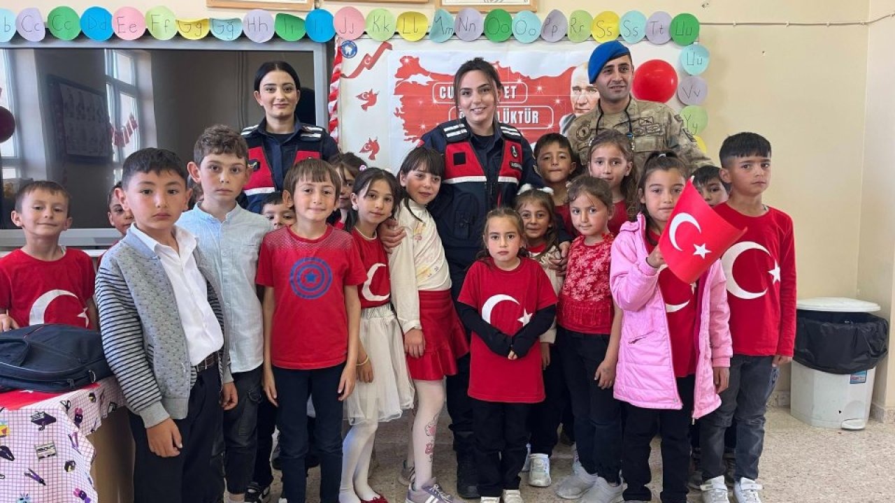 Çocuklara boyama kitabı ve çeşitli hediyeler dağıtan jandarma ekipleri, öğrencilerin 29 Ekim Cumhuriyet Bayramı'nı doyasıya yaşamalarını sağladı.