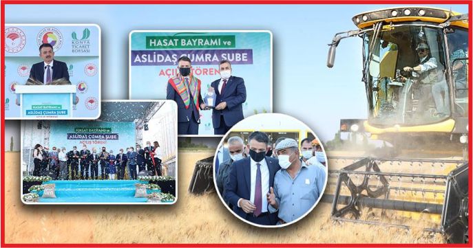 Tarım ve Orman Bakanı Dr. Bekir Pakdemirli, Konya Çumra'da düzenlenen Hasat Bayramı ile Konya Ticaret Borsası iştiraki olan Anadolu Selçuklu Tarım Ürünleri ve Lisanslı Depoculuk A.Ş. (ASLİDAŞ) Çumra Şubesinin açılışına katıldı.