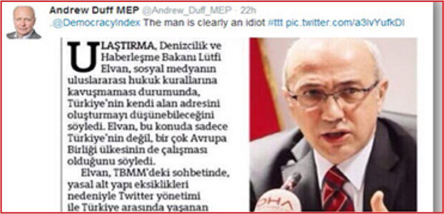 Ulaştırma, Denizcilik ve Haberleşme Bakanı Lütfü Elvan'a atfen yayımlanan "www yerine ttt kurulabilir" başlıklı haberler üzerine Türkiye-AB Karma Parlamento Komisyonu'nun İngiliz üyesi Andrew Duff, dün Elvan'a hakaret içeren bir tweet attı.