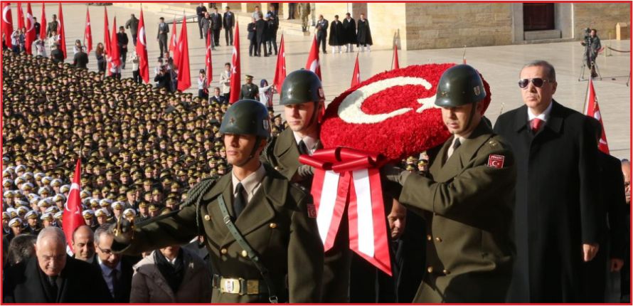 Cumhurbaşkanı Erdoğan, kırmızı beyaz karanfillerden oluşan ay yıldızlı çelengi, Atatürk'ün mozolesine bıraktı. Atatürk'ün 77 yıl önce ebediyete intikal ettiği saat 09.05'de ''ti'' sesi ve sirenler eşliğinde bir dakikalık saygı duruşunda bulunuldu ardından İstiklal Marşı okundu.