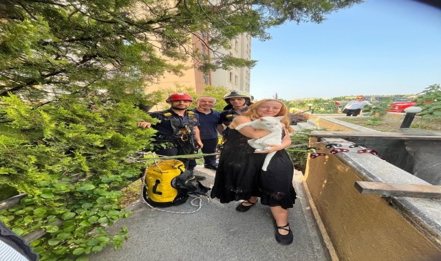 Olay yerine gelen Ankara Büyükşehir Belediyesi İtfaiye ekipleri, havalandırma boşluğuna halatla inerek kediyi kurtardı.