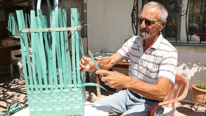 Nevşehir'in Avanos ilçesinde yaşayan memur emeklisi Abdullah Güven, atık plastik şeritleri hasır tarzında örerek dönüştürdüğü sepet ve çantalarla hem geri dönüşüme hem de aile bütçesine katkı sağlıyor.