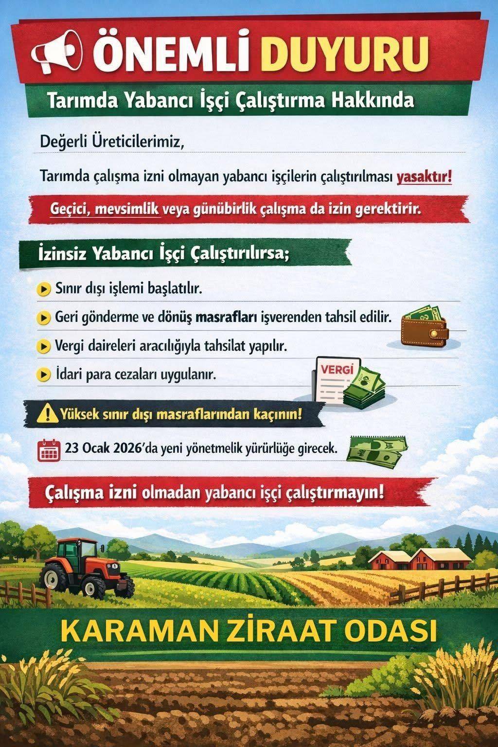 Karaman Ziraat Odası Başkanı Mehmet Bayram, tarım sektöründe yabancı uyruklu işçi çalıştıracak üreticilere yönelik önemli uyarılarda bulundu. Bayram, çalışma izni bulunmayan yabancı işçilerin çalıştırılmasının kesinlikle yasak olduğunu vurguladı.