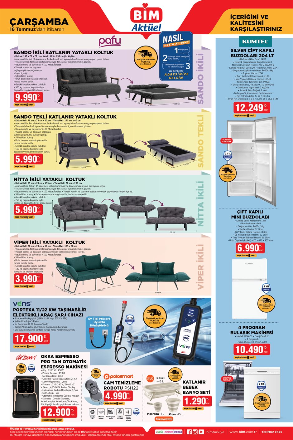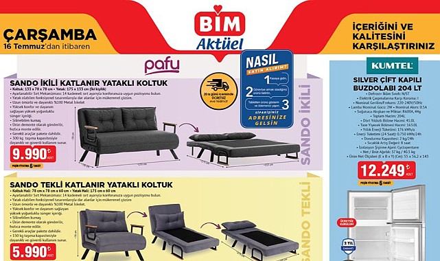 BİM, paylaştığı yeni aktüel kataloğuyla 16 Temmuz’dan itibaren birçok ürünün indirim fırsatıyla satışa çıkacağını açıkladı. Bu kapsamda, koltuk, beyaz eşya ve espresso makinesi başta olmak üzere çeşitli ürünlere dev indirim geleceğini duyuran BİM, özellikle beyaz eşyada peşin fiyatına 6 taksit imkânının da geçerli olacağını paylaştı.