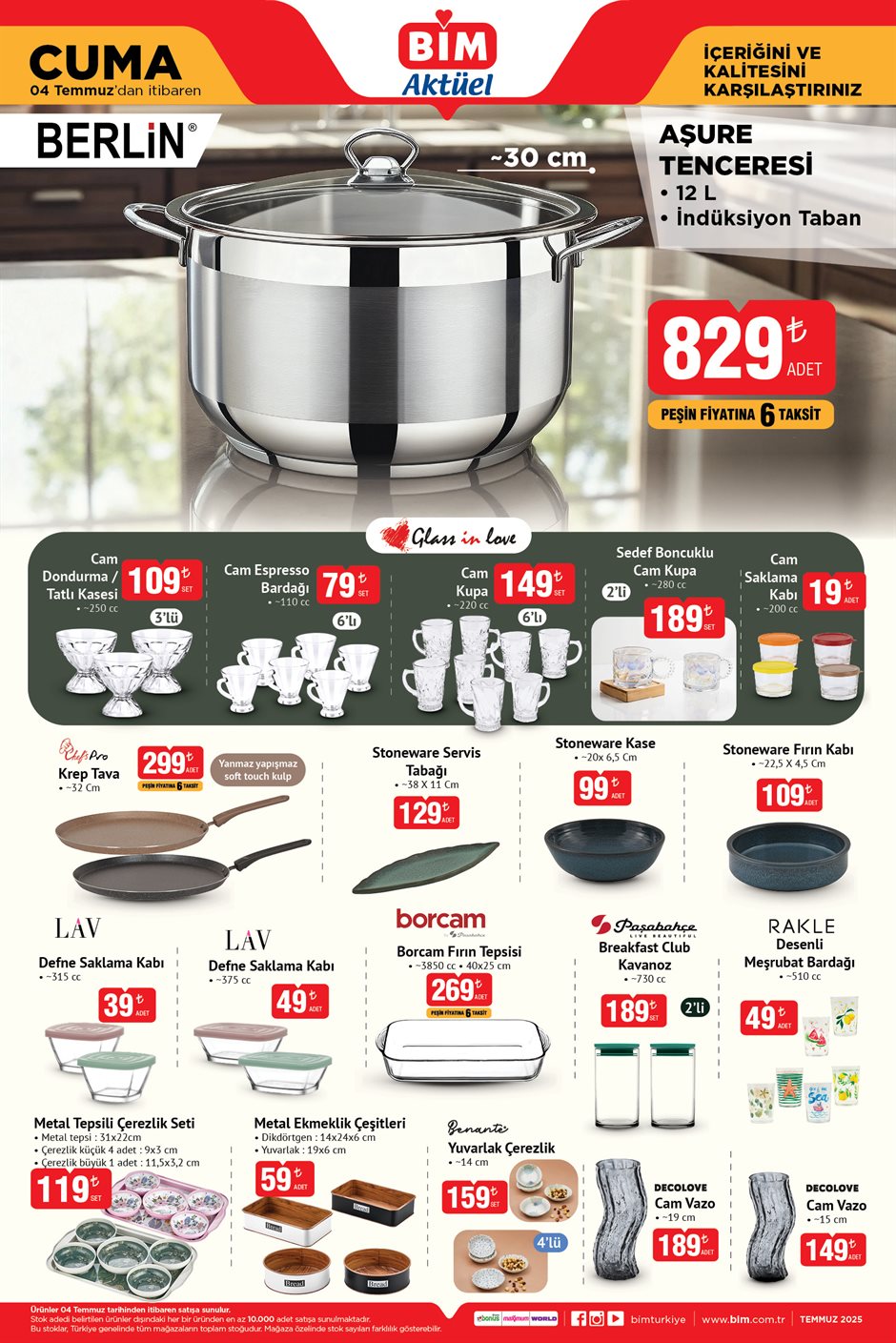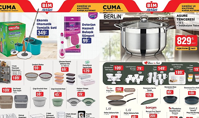 Bu kapsamda, mutfakta konfor arayanlar için 12 litrelik Berlin marka aşure tenceresi 829 liradan alıcı beklerken, Borcam fırın tepsisi, Stoneware tabak ve kaseler, cam kupa setleri ve desenli meşrubat bardakları gibi pek çok ürün satışa çıkacak.