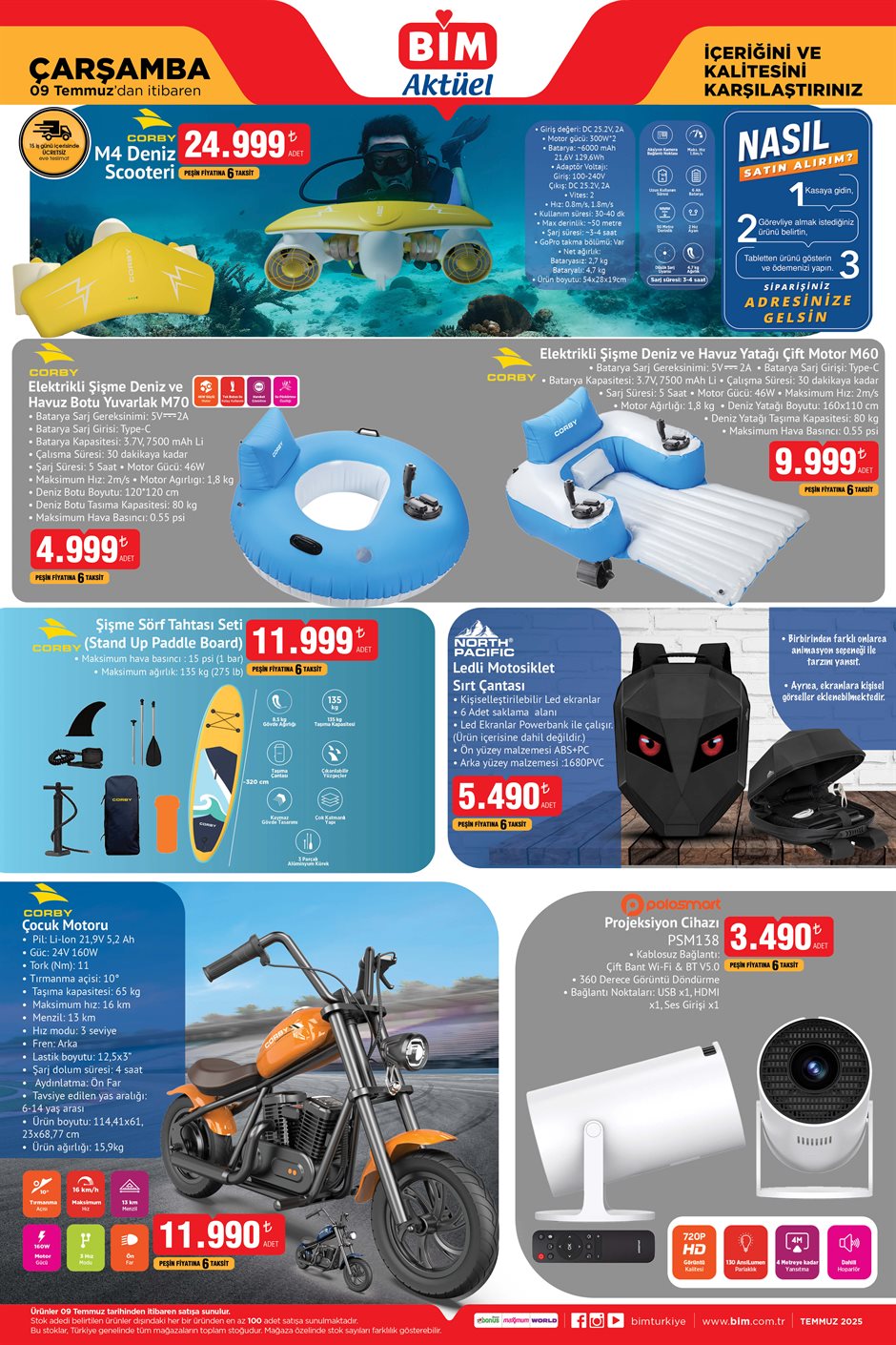BİM, 9 Temmuz’dan itibaren satışa çıkaracağı ürünlerle yaz tatilini geçirmek isteyenlere yeni indirimler sunuyor. Bu kapsamda, Corby markalı M4 Deniz Scooter'ı 24 bin 999 TL fiyatıyla öne çıkarken; şişme deniz botları, sörf tahtası ve çocuk motoru gibi yazlık eğlence ürünleri de cazip fiyatlarla satışa sunulacak.