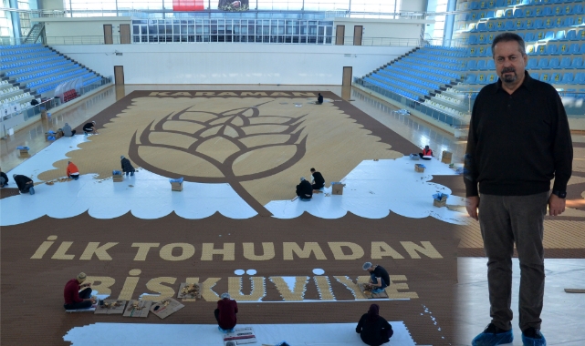 Çalışmalar kapsamında yaklaşık 20 kişilik ekip, Karamanoğlu Mehmetbey Üniversitesi Taha Akgül Spor Salonu'ndaki zemine, 300 bin pötibör kullanarak buğday başağı motifi yapıyor. Proje kapsamında 3 ton bisküvinin kullanılması planlanıyor.