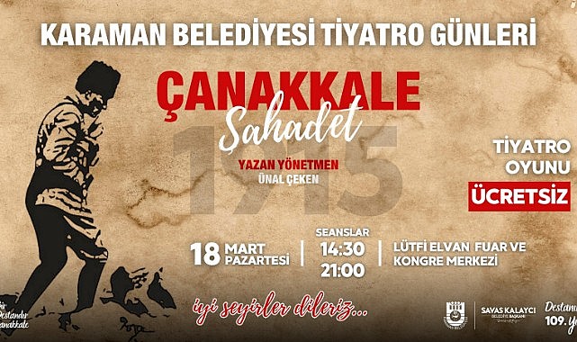 Karaman Belediyesi kültür-sanat etkinlikleri kapsamında bir tiyatro gösterisini daha Karamanlılarla buluşturuyor. 18 Mart Çanakkale Zaferi’nin 109. yıldönümü ve Şehitleri Anma Günü nedeniyle tertiplenen, Ünal Çeken’in yazıp yönettiği "Çanakkale Şahadet" isimli tiyatro oyunu, 18 Mart Pazartesi günü Lütfi Elvan Fuar ve Kongre Merkezi'nde sergilenecek. 14.30 ve 21.00 saatlerinde iki seans halinde sahnelenecek olan ücretsiz tiyatroya tüm halkımız davet edildi.
