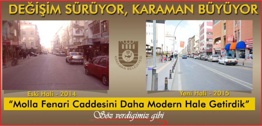 Ertuğrul Çalışkan başkanlığında Karaman Belediyesi, şehrin çehresini değiştiren önemli çalışmalara imza atıyor. Yapılan çalışmalarla daha modern hale getirilen ve şehrin en işlek caddelerinden Molla Fenari Caddesi'ndeki değişim bu durumu gözler önüne seriyor.