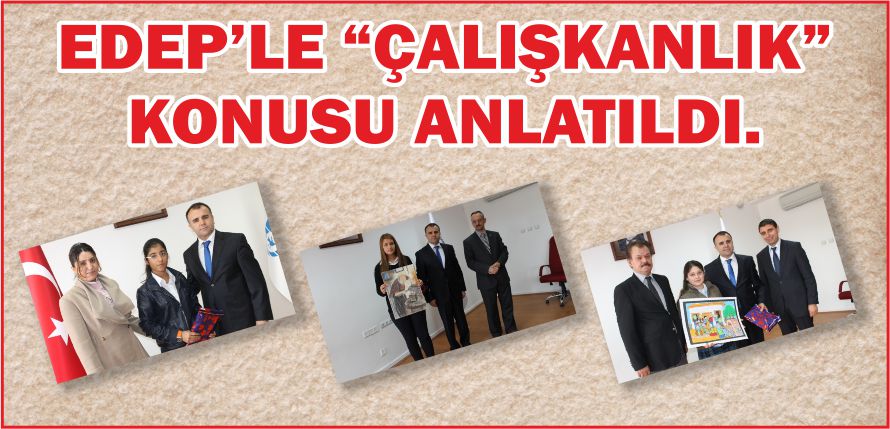 Kısa adı EDEP Eğitimde Değerler Eğitimi Projesi kapsamında okullarımızda “Çalışkanlık” değeri ile ilgili faaliyetler yapıldı. Çalışkanlık konusunda ilkokul, ortaokul ve lise kademelerinde gerçekleştirilen etkinliklerle öğrencilerimiz bu değeri özümseyen çalışmalara imza attılar. Yapılan çalışmalar Milli Eğitim Müdürlüğü tarafından değerlendirilerek “Çalışkanlık” değerini en iyi anlatan okullar belirlendi. Ayrıca afiş, resim, şiir, kompozisyon dallarında dereceye giren ilk üç eser tespit edilerek sahiplerine İl Milli Eğitim Müdürü Asım Sultanoğlu tarafından ödülleri verildi.