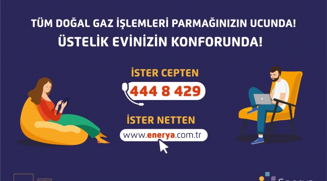 Diğer yandan, işlemlerini evlerinin konforunda gerçekleştirmek isteyen Enerya aboneleri, www.enerya.com.tr adresi üzerinden hızlı bir şekilde işlemlerini yapıyor. Online işlemler; abonelik, fatura, fesih ve talep sorgulama işlemleri olarak dört farklı kategoriden oluşuyor. Kullanıcılar abonelik işlemlerinde online bağlantı anlaşması, abonelik sözleşmesi, bina önünde doğal gaz hattı sorgulaması, sertifikalı firmaları sorgulama, proje ve randevu durumunu öğrenme, bilgi güncelleme gibi hizmetlerden faydalanabilirken; fatura işlemlerinde ise fatura görüntüleme, fatura son ödeme tarihini erteleme işlemlerini gerçekleştirebiliyor.