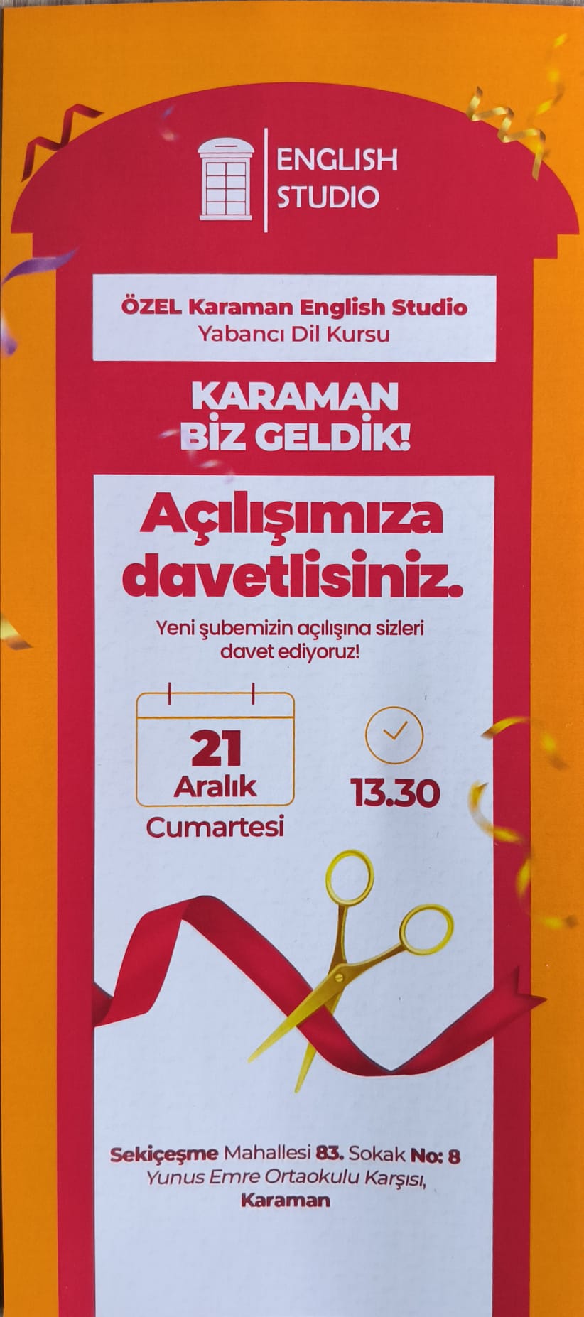 Not: Karaman halkı açılışa davetlidir! English Studio ailesi, bu özel günde Karamanlılarla bir arada olmayı dört gözle bekliyor.