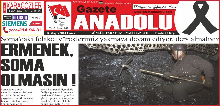 Soma’da yüzlerce vatandaşımızı kaybetmenin acılarını tüm ulusça yaşıyoruz. Burada yaşanan felaket, gözleri ,maden ve kömür ocaklarına çevirdi.Ermenek ilçemizde faaliyet gösteren kömür ve maden ocaklarımız yeniden gözden geçirilmeli ve yaşanacak büyük bir felaketin önüne geçilmeli.