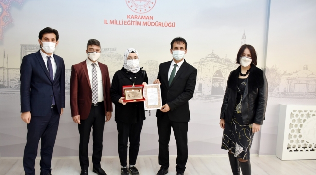 İstiklâl Marşı'nın kabulü ve Mehmet Akif Ersoy'u Anma Günü etkinlikleri kapsamında "On Kıta Bir Vatana, İlelebet İstiklâl" 2021 temasına uygun olarak Milli Eğitim Bakanlığı, Meslekî ve Teknik Eğitim Genel Müdürlüğüne bağlı olan okullar arasında ülke çapında düzenlenen "İstiklâl Marşı'nın Kabulü ve Mehmet Akif Ersoy'u Anma Günü Çevrim içi Slogan Yarışması'nda" il birincisi olan Karaman Güzel Sanatlar Lisesi öğrencisi Niğmet Nur Gündüz ödülünü İl Milli Eğitim Müdürü Mehmet Çalışkan'dan aldı.