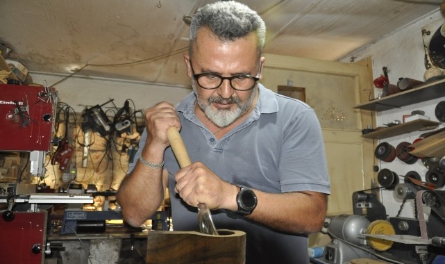 Zamanla tutku haline gelen ahşap işlemeciliğe yönelen Yavuz, 8 yıl önce başladığı bu uğraşında malzemeyi oyma işlemi için farklı bıçak türleri edindi.