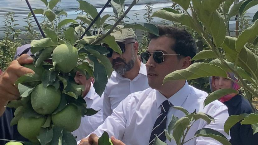 Ermenek Kaymakamı Uğur Almalı, ilçede ilk hasadını veren elma bahçesini ziyaret ederek üreticilerin sevincine ortak oldu