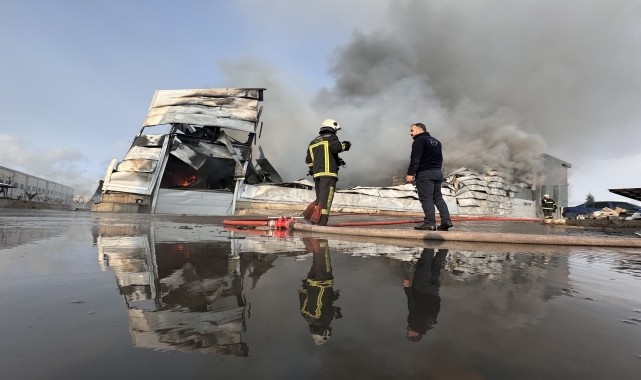 Fabrikaya gelen Büyükşehir Belediye Başkanı Memduh Büyükkılıç ve Organize Sanayi Bölgesi Başkanı Mehmet Yalçın, yangına ilişkin ekiplerden bilgi aldı.