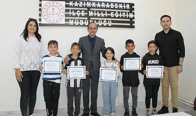 Milli Eğitim Müdürü Mustafa Eryiğit "mutlu ve başarılı öğrenciler hedefimize yönelik çalışmalardan biri olan "Kazımkarabekir Güzel Yazıyor" projesinde mart ayında en güzel yazı yazan öğrencilerimize belgelerini veriyoruz.