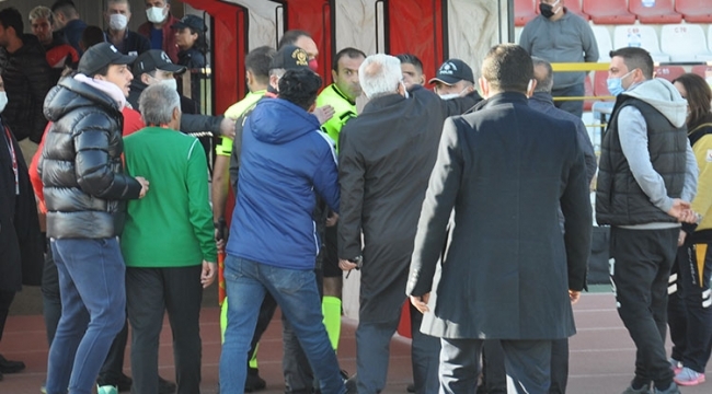 Maçın son düdüğünün ardından Hakem Deniz Kükrek tünele giderken Karaman Belediyespor'dan kim önüne geldiyse tartışmış, şaşkınlık yaratan tavırlarına tüm stad tepki göstermişti.