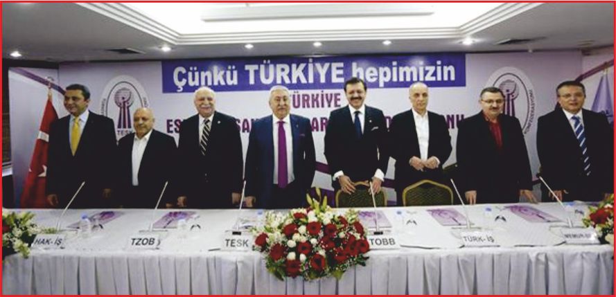 Toplumun farklı kesimlerini temsil eden Türkiye Odalar ve Borsalar Birliği (TOBB), Türkiye Ziraat Odaları Birliği (TZOB), Türkiye İşçi Sendikaları Konfederasyonu (TÜRK-İŞ), Türkiye İşveren Sendikaları Konfederasyonu (TİSK), HAK İş Sendikaları Konfederasyonu (HAK-İŞ), MEMUR Sendikaları Konfederasyonu (MEMUR-SEN), Türkiye Kamu Çalışanları Sendikaları Konfederasyonu (T.KAMU-SEN) ve Türkiye Esnaf ve Sanatkarları Konfederasyonu(TESK) temsilcileri kamuoyuna ortak bir çağrı metni üzerinde çalışıyorlar. Hürriyet, daha toplantı sürerken, patronundan işçisine, memurundan, çiftçisine tüm kesimlerin üzerinde çalıştığı bildirinin taslağını ele geçirdi. "Çünkü Türkiye hepimizin..." başlığı ile yayınlanacak bildiride ana mesaj, "hem yolsuzluk iddiaları, hem paralel devlet iddiaları, toplumsal barışı ve istikrarı tehdit ediyor" olarak ortaya çıktı.