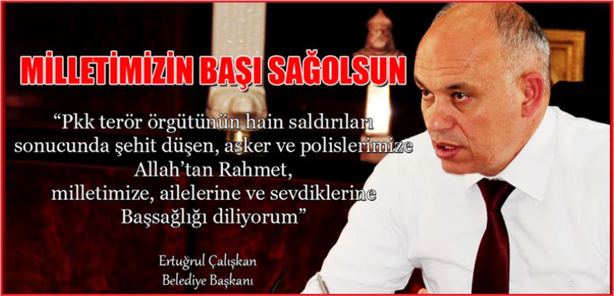 Belediye Başkanı Ertuğrul Çalışkan Mesajında; " Ülkemizde son günlerde hain eylemlerini her geçen gün artıran pkk terör örgütünün saldırıları sonucu dün 16 askerimiz bugün ise ilk belirlemelere göre 12 polisimiz şehit olmuşlardır. Yüzyıllarca kardeşçe yaşadığımız bu topraklar üzerinde, içeriden ve dışarıdan bir takım hain eller birlikte yaşama isteğimize nifak tohumları ekmeye çalışıyorlar. Bu terör olayları lanetle kınıyorum.