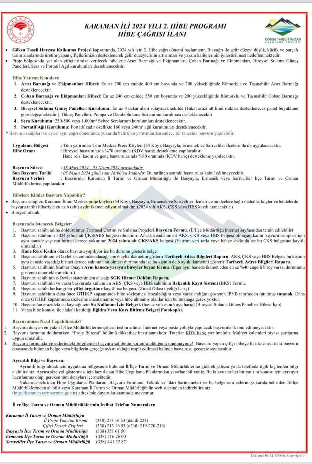 Karamaz Ziraat Odası, Göksu Taşeli Havzası Kalkınma Planına ilişkin açıklama yaptı. Odadan yapılan açıklamada, “2024-2. Hibe Uygulama planları onaylanmıştır. Bu kapsamda 18.03.2024 tarihinde de başvuruları almaya başlanıp 5.04.2024 tarihi saat 16:00 a kadar devam edecektir. Başvuru evrakları Karaman İl Tarım ve Orman Müdürlüğü internet sitesinde yayınlanacak olup başvuru evrakları doldurularak Tarım ve Orman İl Müdürlüğüne teslim edilecektir” denildi.