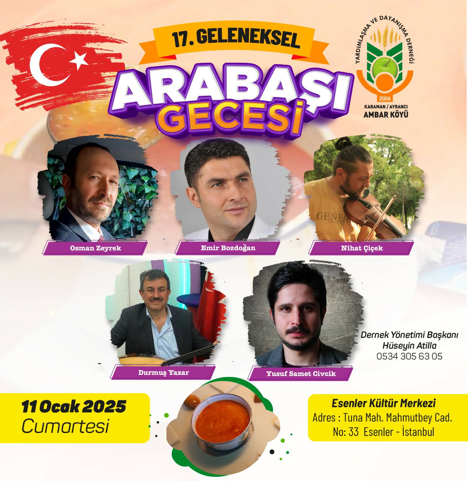 Karaman Ayrancı Ambar Köyü Yardımlaşma ve Dayanışma Derneği, 17. Geleneksel Arabaşı Gecesi’ni 11 Ocak 2025 Cumartesi günü saat 19.00-23.30 arasında Esenler Kültür Merkezi’nde gerçekleştirecek. Hemşerilik bağlarını güçlendirmek ve dayanışmayı artırmak amacıyla düzenlenen bu etkinlikte, Karaman’ın geleneksel lezzeti olan arabaşı çorbası eşliğinde keyifli bir gece planlanıyor.