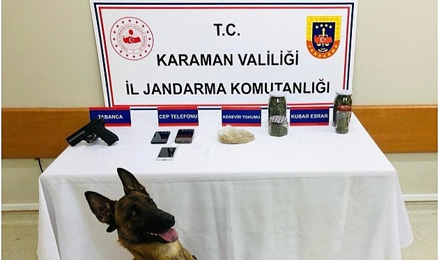 Bu çalışmalar kapsamında Y.Ş. isimli şahsın evinde uyuşturucu madde bulundurduğu ve satışa sunduğu bilgisini alan Jandarma Y.Ş.’nin ikametgahında ve eklentilerinde uyuşturucu madde arama köpeği Erek’in de katıldığı aramayla 120 gram kubar esrar, 155 gram kenevir tohumu ve 1 adet tabanca ile 3 adet cep telefonu ele geçirdi.