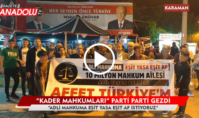Adli mahkumlar için aylardır af isteyen Adil Yaşam Derneği Karaman temsilcisi Abit Çoban, seçim arifesinde siyasi partilerin kapısını çaldı. Karaman’daki siyasi partilerin seçim bürosunu ziyaret eden Abit Çoban’a Karaman’daki izinde olan mahkum ve yakınları da eşlik etti. Ellerindeki “Adli mahkuma eşit yasa eşit af”, “10 milyon mahkum ailesi”, “Affet Türkiyem” yazılı pankart eşliğinde gerçekleşen ziyaretlerde adli mahkumlar için af talebinde bulunuldu.