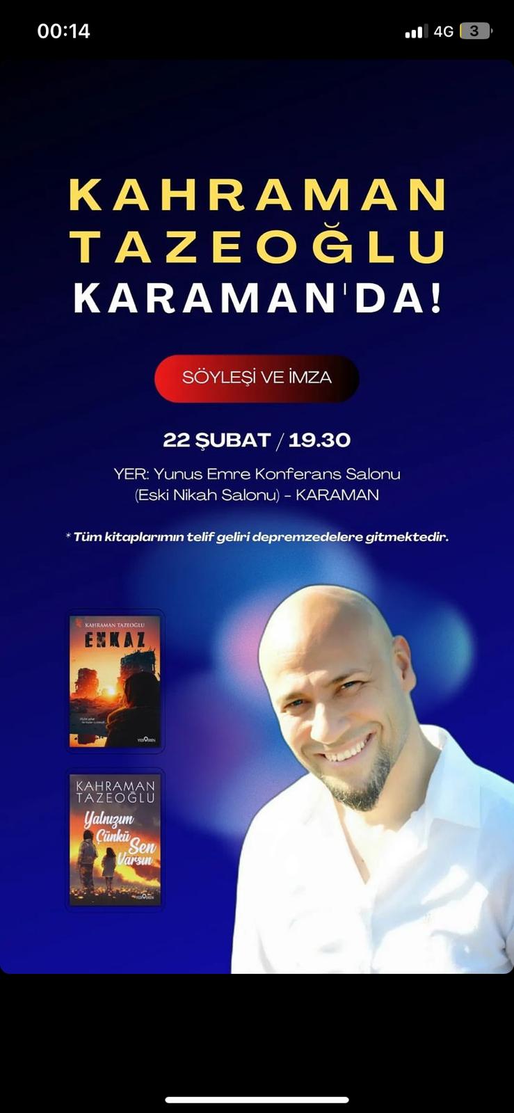 Tazeoğlu Yunus Emre Konferans Salonu'nda 22 Şubat saat 19:30'da ( Bugün) Karamanlı okurları ile buluşacak