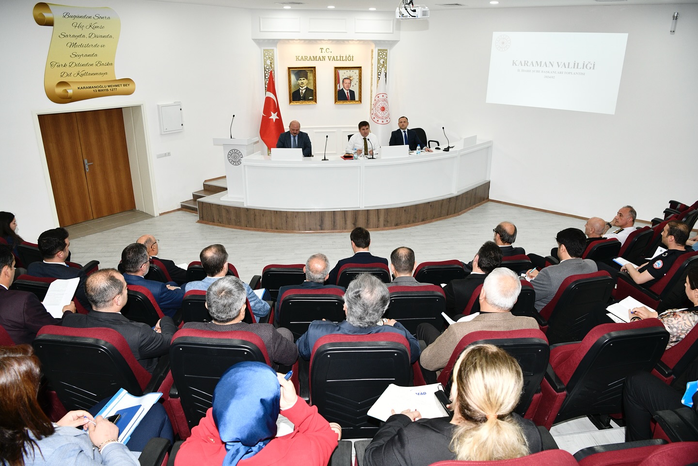 5442 Sayılı İl İdaresi Kanunu’nun 24. maddesi gereğince, idarede birliğin sağlanması, işlerin gözden geçirilerek düzenleştirilmesi, teşkilatın ahenkli çalışması için gerekli tedbirlerin alınmasını görüşmek ve kararlaştırmak amacıyla yapılan İl İdare Şube Başkanları toplantısı Karaman Valisi H. Engin Sarıibrahim Başkanlığında gerçekleştirildi.