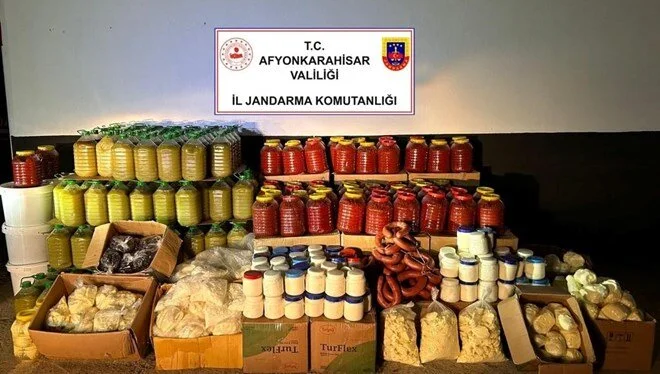 Afyonkarahisar'da jandarma ekipleri bir otomobile sahte gıda operasyonu düzenledi. Jandarma ekipleri tarafından durdurulan araçta bir ton 120 kilogram sahte zeytinyağı, 970 kilo domates salçası, 63 kilo tereyağı, 104 kilo dil peyniri, 30 kilo siyah zeytin, 130 kilo tulum peyniri, 20 adet kangal sucuk ve 8 kilo lor peyniri ele geçirdi.
