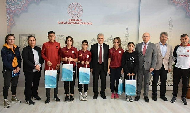 16-17 Şubat 2024 tarihinde Bursa'da düzenlenen Atletizm Çoklu Branşlar Türkiye Şampiyonası'nda Karaman'ı temsil ederek büyük bir başarıya imza atan ve altın madalyanın sahibi olan Zübeyde Hanım Ortaokulu öğrencisi Muhammed Kerem Akkuş ve kız atletizm takımı, İl Millî Eğitim Müdürlüğünü ziyaret etti.