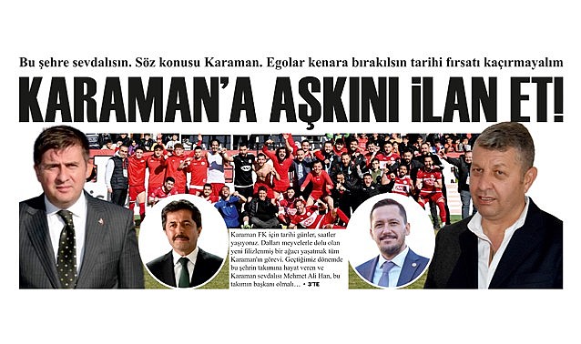 Karaman FK için tarihi günler, saatler yaşıyoruz. Dalları meyvelerle dolu olan yeni filizlenmiş bir ağacı yaşatmak tüm Karaman’ın görevi. Geçtiğimiz dönemde bu şehrin takımına hayat veren ve Karaman sevdalısı Mehmet Ali Han, bu takımın başkanı olmalı… Bilgisi, birikimi, deneyiminin yanı sıra ekonomik gücü ile Karaman FK’yı zirvelere taşır, gelecek yıl şampiyon Karaman olarak ismimizi herkese ezberletir ve Spor-Toto 1. Lig’inin yeni takımı yapar.