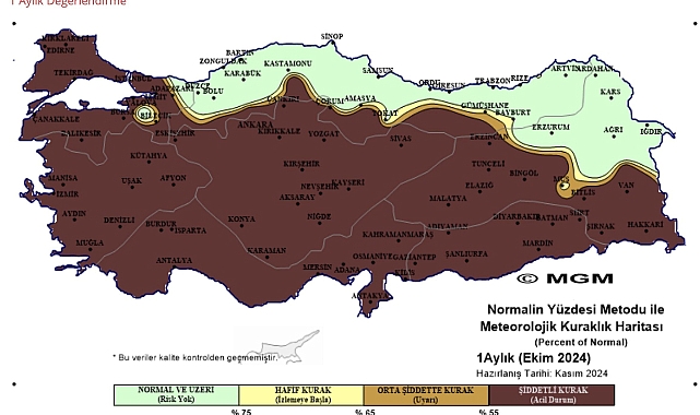 Çevre, Şehircilik ve İklim Değişikliği Bakanlığı'na bağlı Meteoroloji Genel Müdürlüğü'nün (MGM) normalin yüzdesi metoduna göre oluşturduğu, 2024 ekim ayı meteorolojik kuraklık durumu haritası da Türkiye'deki kuraklık boyutunu gözler önüne serdi.