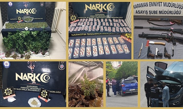 Denetimler esnasında 3 adet ruhsatsız tabanca, 3 adet ruhsatsız tüfek, 3 adet kesici delici-alet, 2068 gram uyuşturucu madde, 2 bin 602 adet uyuşturucu hap, 31 gram esrar tohumu ve 11 kök kenevir ele geçirildi.