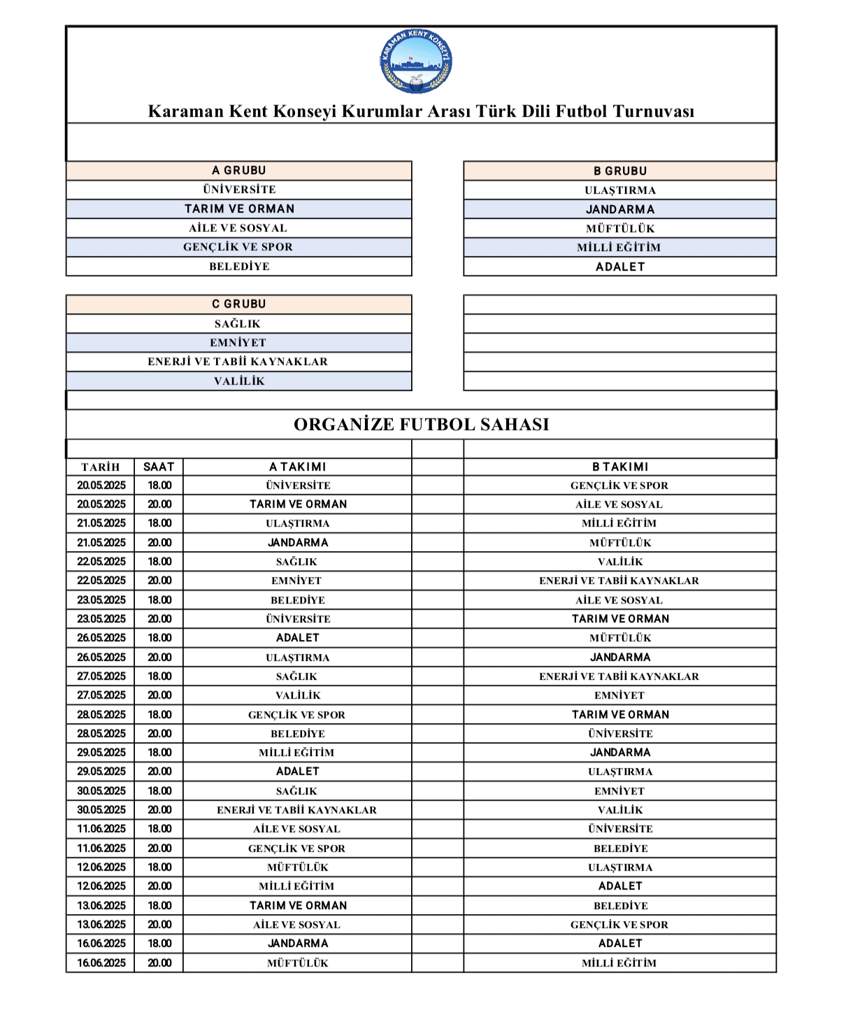 Karaman Kent Konseyi tarafından organize edilen "Kurumlar Arası Futbol Şöleni", bugün (20 Mayıs 2025 Salı) saat 18.00'de Organize futbol sahasında ilk başlama vuruşu ile başlayacak. Karaman'da spor etkinliklerine verdiği katkılarla bilinen Kent Konseyi, bu yıl 3. kez düzenlediği Kurumlar Arası Türk Dili Futbol Turnuvası ile dikkat çekiyor.