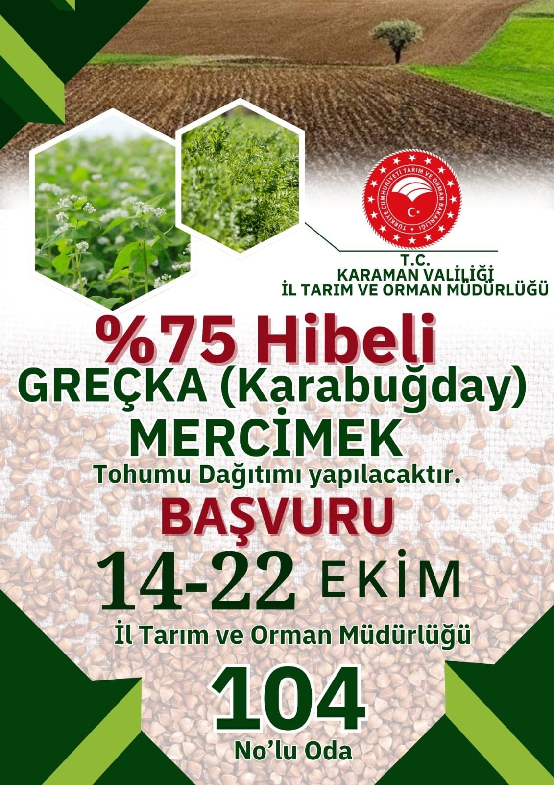 Karaman Tarım ve Orman İl Müdürlüğü, üreticilere yönelik önemli bir destek programı duyurdu. Yapılan açıklamaya göre, ildeki kıraç, sulanmayan ve nadasa bırakılacak arazilerin tarımsal üretime kazandırılması amacıyla %75 hibeli “greçka (karabuğday)” ve “mercimek” tohumu dağıtımı yapılacak.