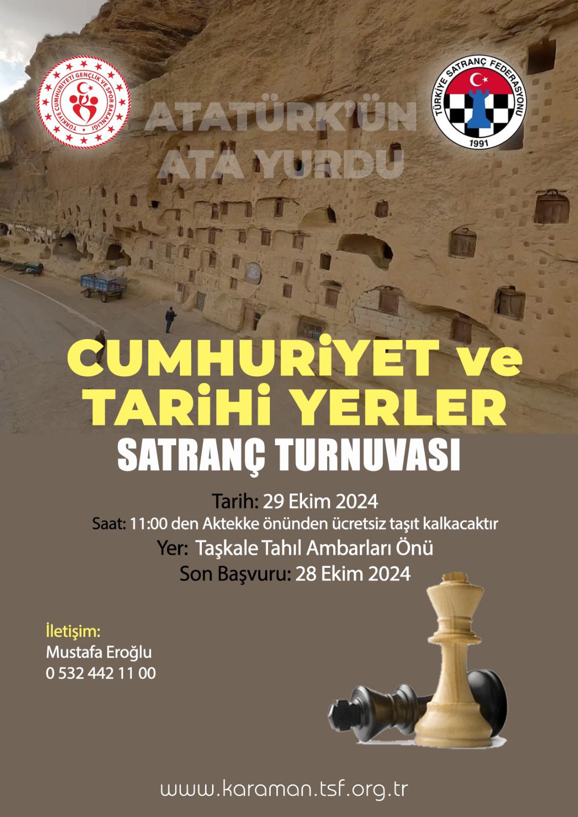 “Cumhuriyet ve Tarihi Yerler Satranç Turnuvası” 29 Ekim’de Taşkale’de düzenlenecek turnuva için devam eden başvurular 28 Ekim Pazartesi günü sona erecek