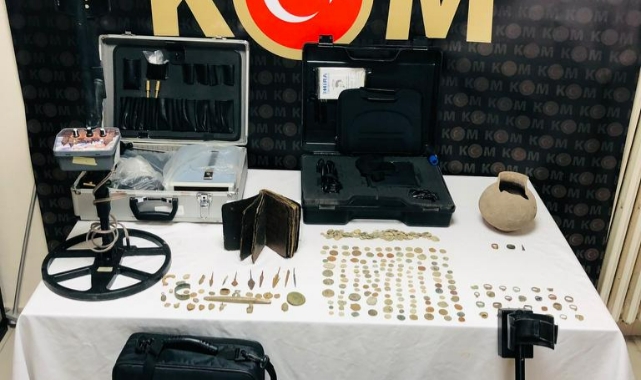 Şüphelilerin ev ve iş yerlerindeki aramalarda, 277 sikke, 27 yüzük, 1 testi, 9 ok ucu, 28 obje, 2 detektör, 1 zemin ölçmede kullanılan cihaz, detektörlere ait muhtelif cihazlar ele geçirildi.