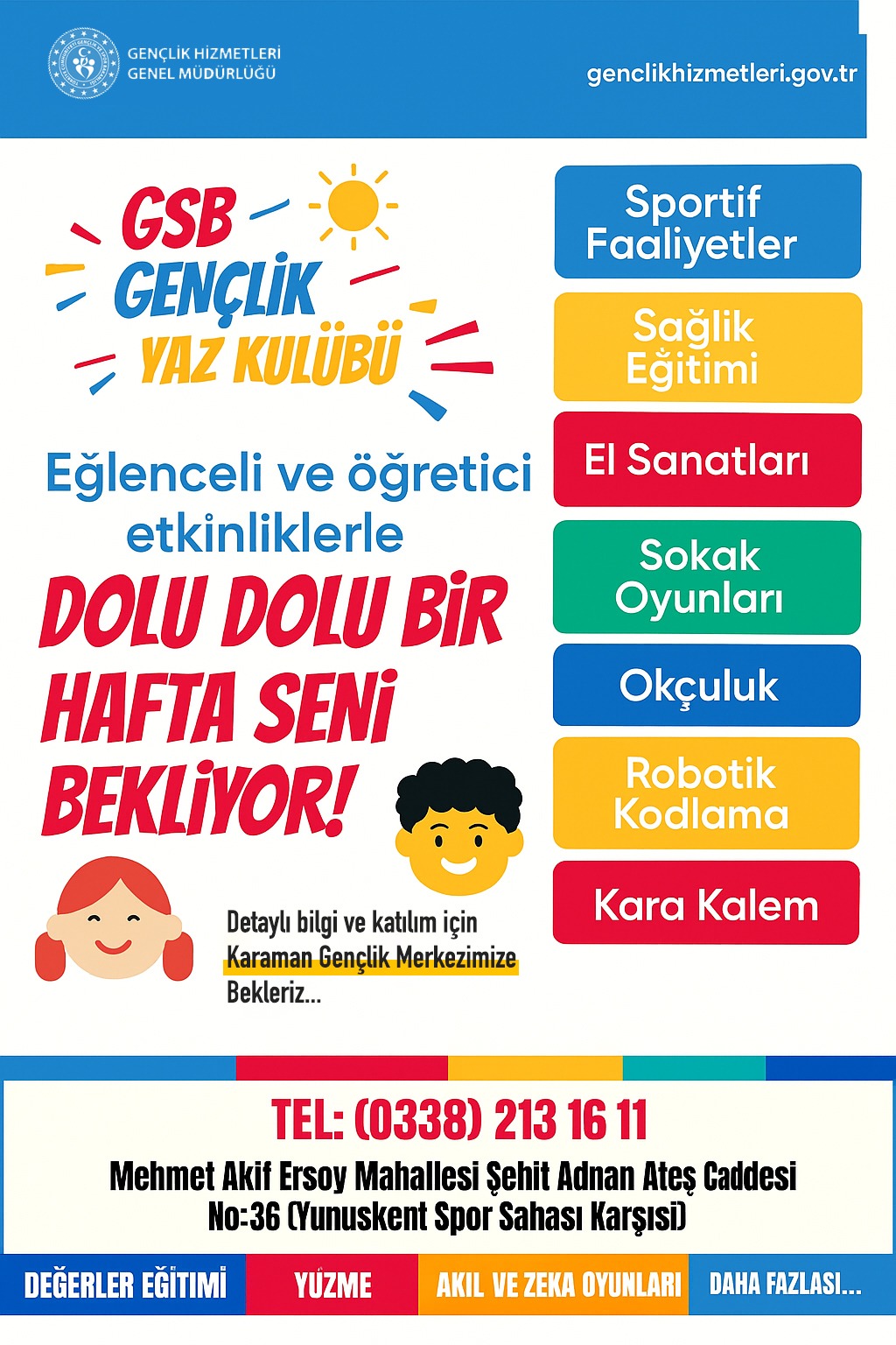 Karaman Gençlik Merkezi, 2025 yaz tatilinde gençleri unutulmaz bir serüvene davet ediyor. Gençlik ve Spor Bakanlığı tarafından ülke genelinde eş zamanlı olarak hayata geçirilecek olan “GSB Gençlik Yaz Kulübü” programı kapsamında, Karaman’da da birbirinden renkli etkinlikler düzenlenecek.