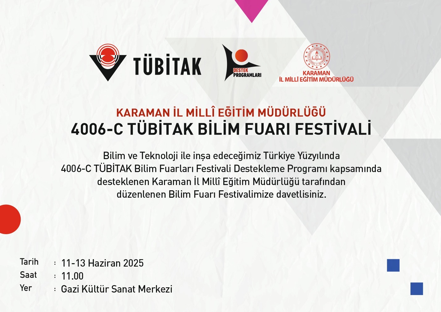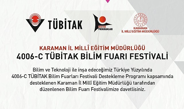 Karaman İl Millî Eğitim Müdürlüğü, Strateji Geliştirme Şubesi Ar-Ge Birimi tarafından organize edilen 4006-C TÜBİTAK Bilim Fuarı Festivali, 11-13 Haziran 2025 tarihleri arasında Gazi Kültür Sanat Merkezi'nde gerçekleştirilecek.